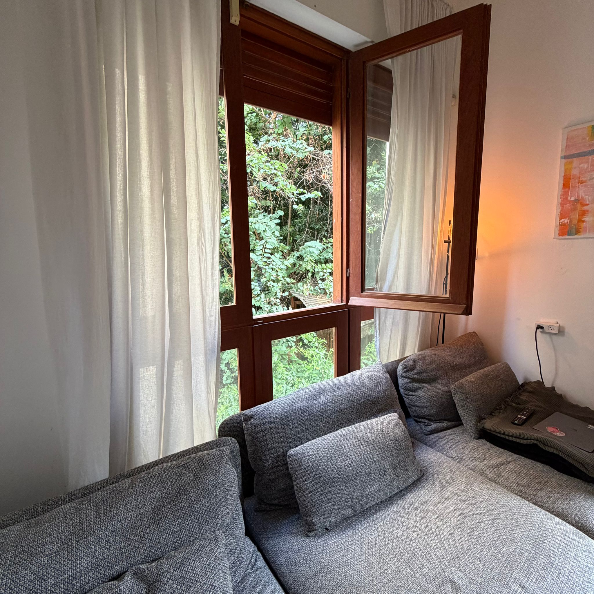 The apartment is rear-facing and completely quiet, overlooking an open green view, with north-east exposures.
