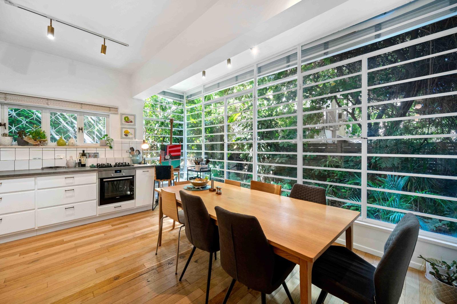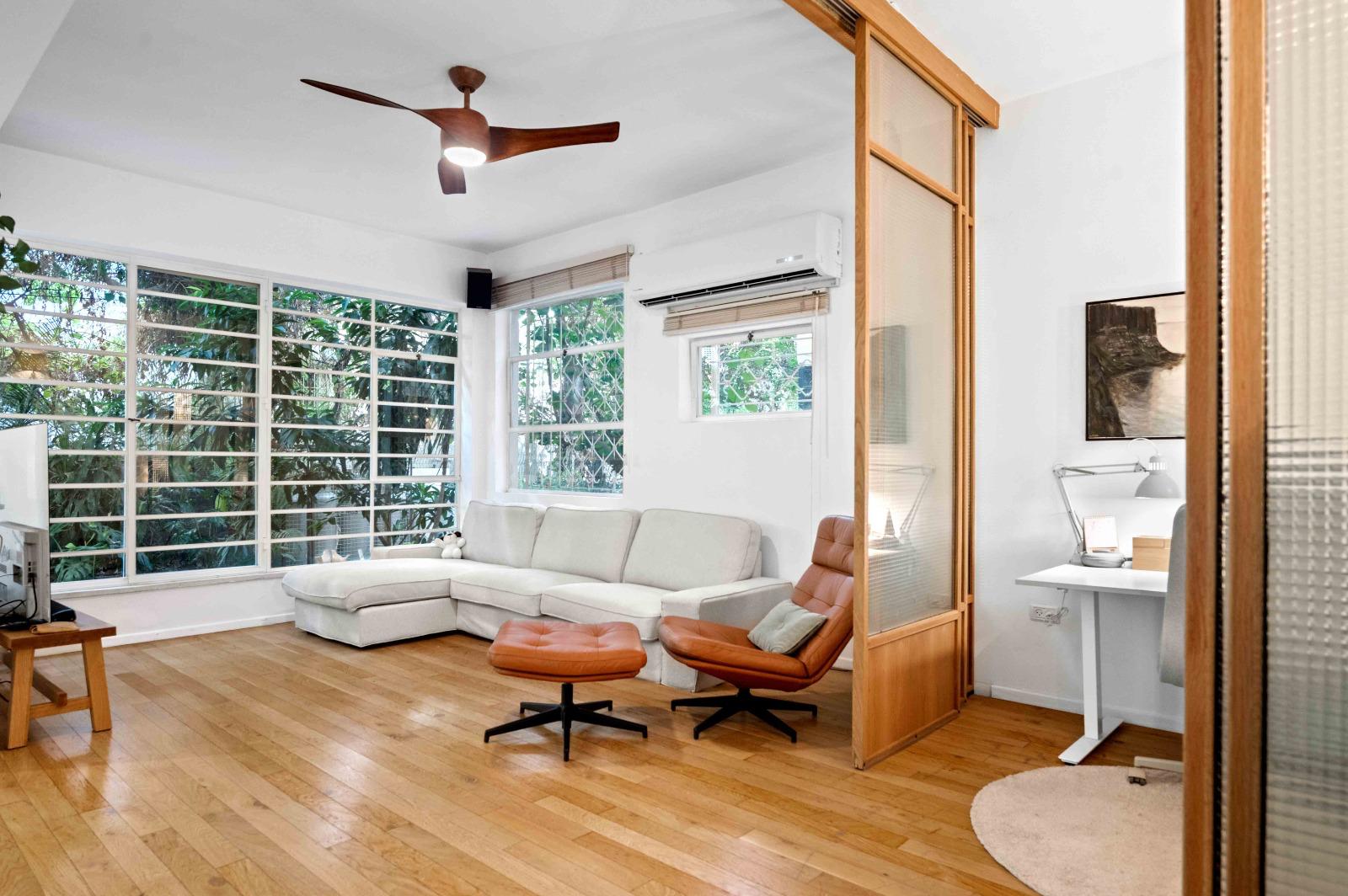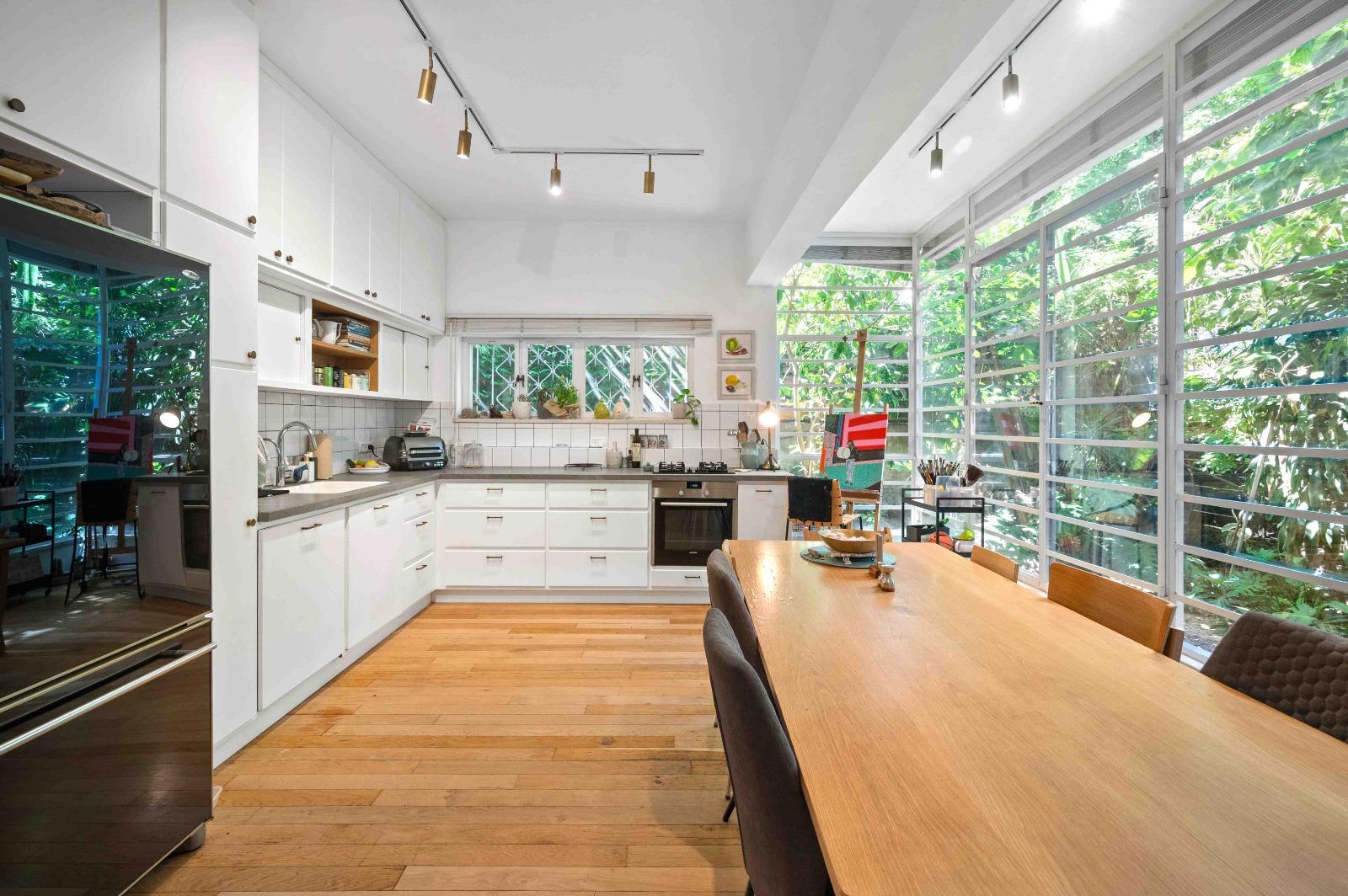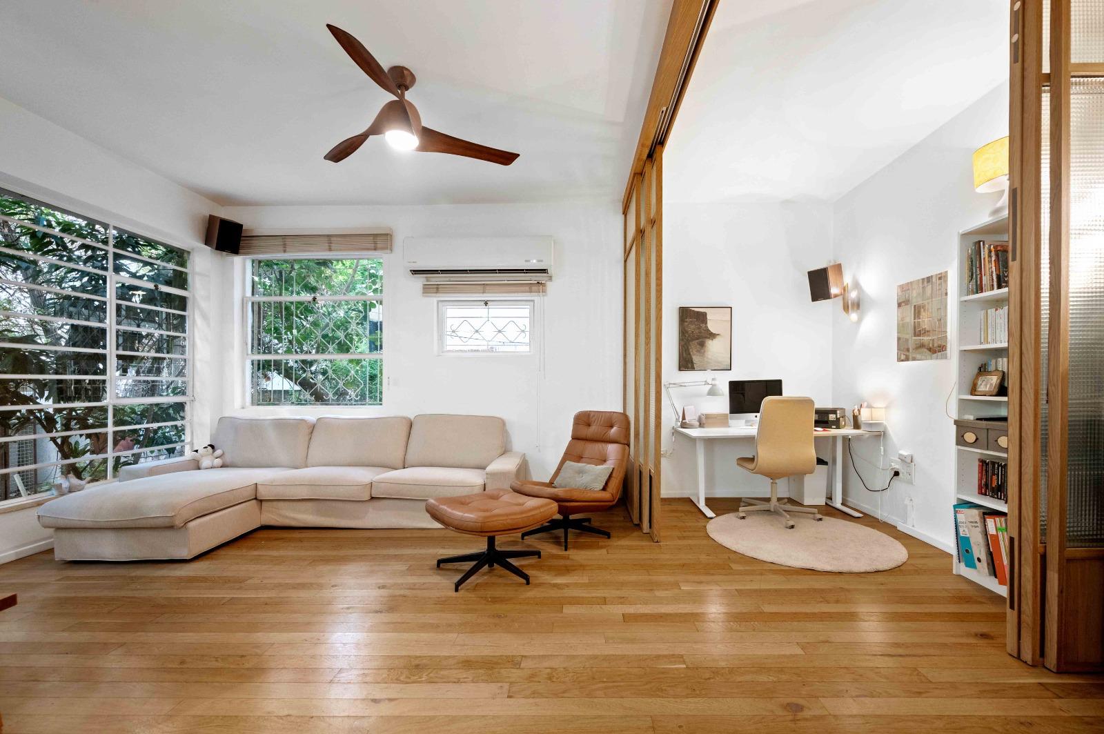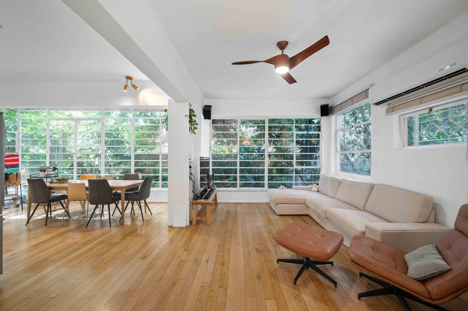 The high ceilings and open exposure to a quiet, landscaped garden create an impressive sense of space and a refined living experience in the most iconic and sought-after boulevard in Tel Aviv.