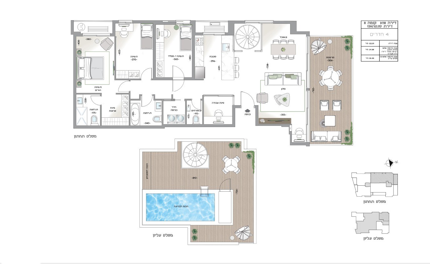 Luxury penthouse with a swimming pool, in a sought-after location in the Old North (of Tel Aviv). The property spans an approximate built and designed area of 123 sqm, including 4 rooms with perfect and precise architectural planning, a sun balcony of approximately 23 sqm, plus a 55 sqm private rooftop featuring a luxurious private swimming pool overlooking the view. The penthouse benefits from northwest air exposures and one private parking space. The expected occupancy for the property is August 2028.