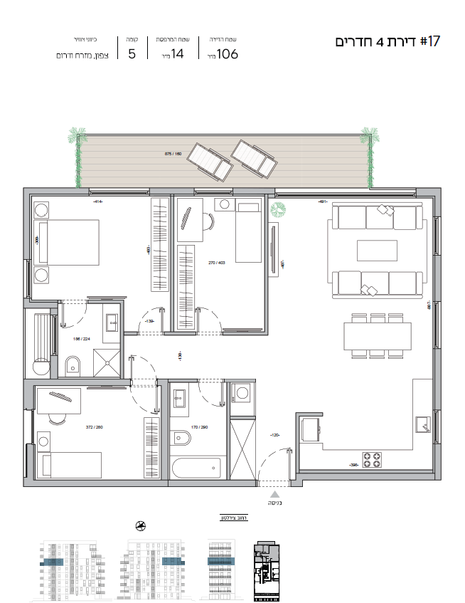 In a new project located on a quiet one-way street, close to Yarkon Park and Yehuda HaMaccabi Street, on the fifth floor, a 4-room apartment with an area of approx. 106 sqm + 14 sqm sun balcony and an underground terrace.