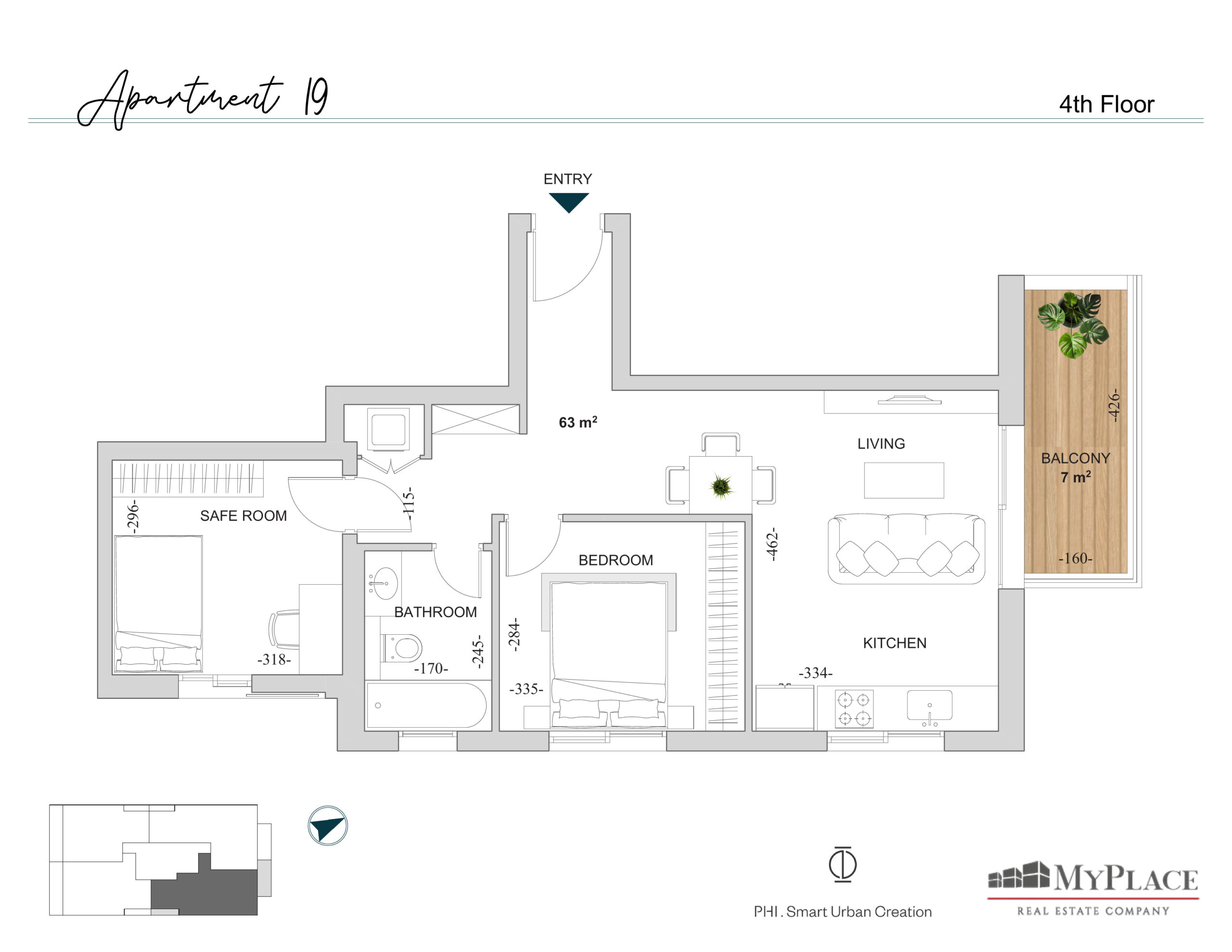 A 3-room apartment on the 4th floor, approx. 63 sqm smartly designed + a 7 sqm sun balcony, bright and front-facing.